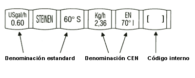 Steinen marca las toberas según CEN NORM (EN 293/299) Steinen es desde hace largo tiempo una firma para aceros afinados de calidad sobresaliente. La CEN NORM (EN 293/299) se emplea ya desde hace años en la producción Steinen. Recientemente Steinen ha introducido la identificación de todas la toberas (0,40 hasta 1,75 Gal/h) según la norma CEN. Esta nueva acuñación de las toberas se introdujo en la producción a partir de Diciembre 2003 y desde entonces se impuso poco a poco en la distribución.